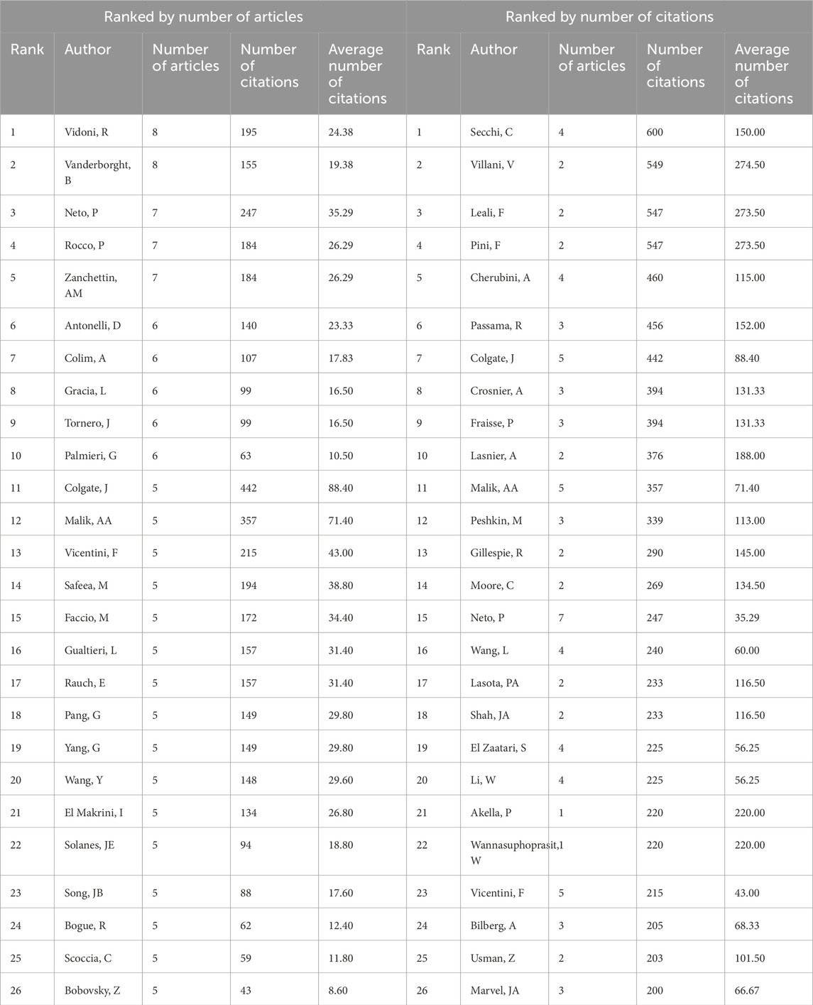Analyzing the number of publications and citations of authors, and mapping co-authorship relationship, allows for the identification of the most productive and influential authors and the most prominent research groups in the field, according to the PRISMA-ScR process applied for literature selection (see Figure 1). This information is invaluable for researchers seeking collaboration and insights from leading experts. The 532 retrieved papers were contributed by 1704 authors, with 26 authors having at least 5 publications, and 26 authors having a minimum of 200 citations (see Table 5). Understanding authors’ contributions to the cobotics research field requires evaluating both the number of articles and citations, and authors are ranked based on these metrics in Table 5. Even though this paper reviewed as many relevant papers as possible, the results are limited to documents retrieved through the PRISMA-ScR process described in Figure 1. For example, some publications may not be indexed in the WoS database, may have been missed due to the chosen search string, may have been excluded based on criteria such as being conference proceedings. These limitations could introduce inaccuracies. Another potential source of bias is the inability to distinguish between authors with identical names. Likewise, authors who publish under different names may not be correctly linked. To address this issue, it is strongly recommended that researchers be assigned a unique, persistent identifier, such as the Open Researcher and Contributor ID (ORCID), upon publishing their first paper. This would help resolve such issues, regardless of how a researcher’s name appears across different publications (van Nunen et al., 2018; Chiu and Ho, 2007).