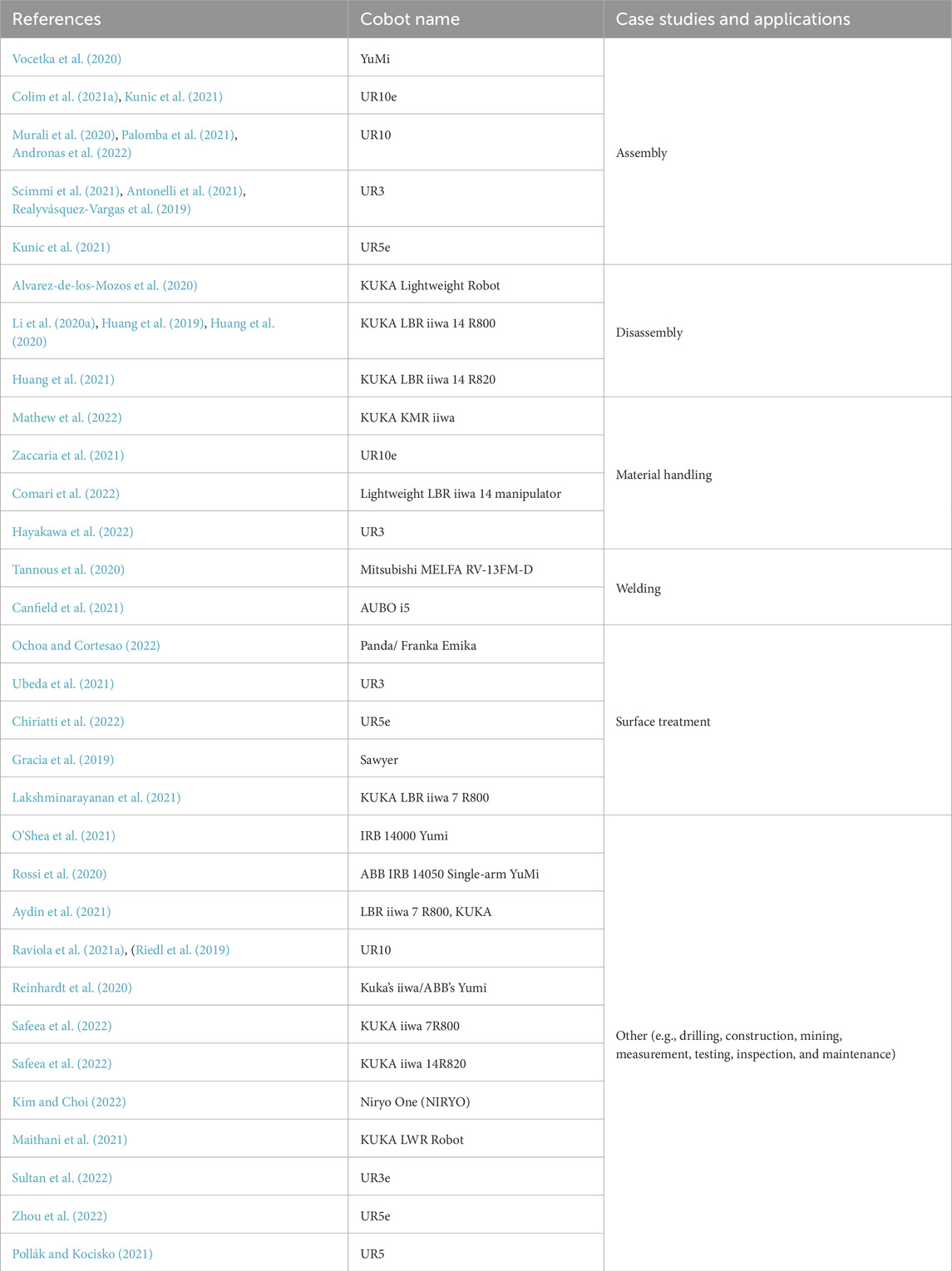 Growing interests on cobots in commercial markets has been investigated in the literature. These papers presented here explore the market potential and future prospects of cobots. For example, scholars have predicted that the significance of cobots will continue to grow (Bogue, 2022; Bogue, 2016b; Bloss, 2016). Although the cobotic is a relatively new research topic in the industrial robotics, the applications of cobots are rapidly expanding in industrial sectors such as assembly, packaging, and surface treatment. This category also covers the papers that use cases explained how to deploy efficiently cobots for studied applications. Table 6 presents an outline of the deployment of collaborative applications.