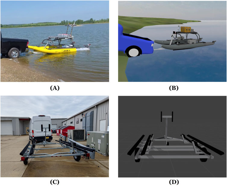 Figure 1. Illustrations of the trailer loading setup and simulation environment: (A) Real-world trailer loading with the ASV, (B) Gazebo-based simulation environment, (C) Physical trailer hardware, and (D) Blender trailer model.