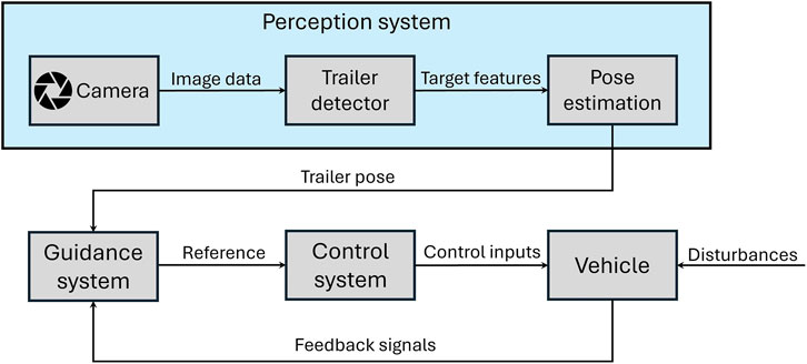 Figure 2. Overview of the proposed vision-based trailer loading system. The architecture integrates real-time image processing and a finite state machine (FSM)-based control strategy to enable robust alignment and docking in dynamic environments.