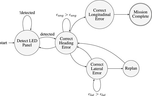 In the starting state, it will rotate itself until it detects the LED panel. Once the LED panel is detected, it will enter the Correct Heading Error state. A PI controller is utilized to minimize the heading error