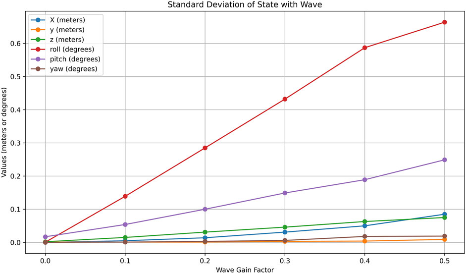 Figure 6. Effects of varying wave disturbance gains on ASV state variables. Plots show standard deviation in position and orientation, revealing increased roll and heave under higher wave amplitudes, which impact perception and stability.
