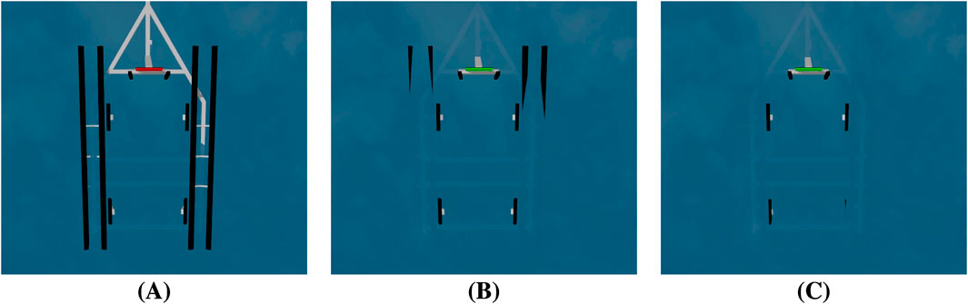 Figure 7. Visualization of trailer submersion under increasing wave heights. (A) Low waves: bunk boards remain fully exposed. (B) Moderate waves: partial submersion of long bunk boards. (C) High waves: complete submersion of long and side bunk boards, reducing visibility for detection.