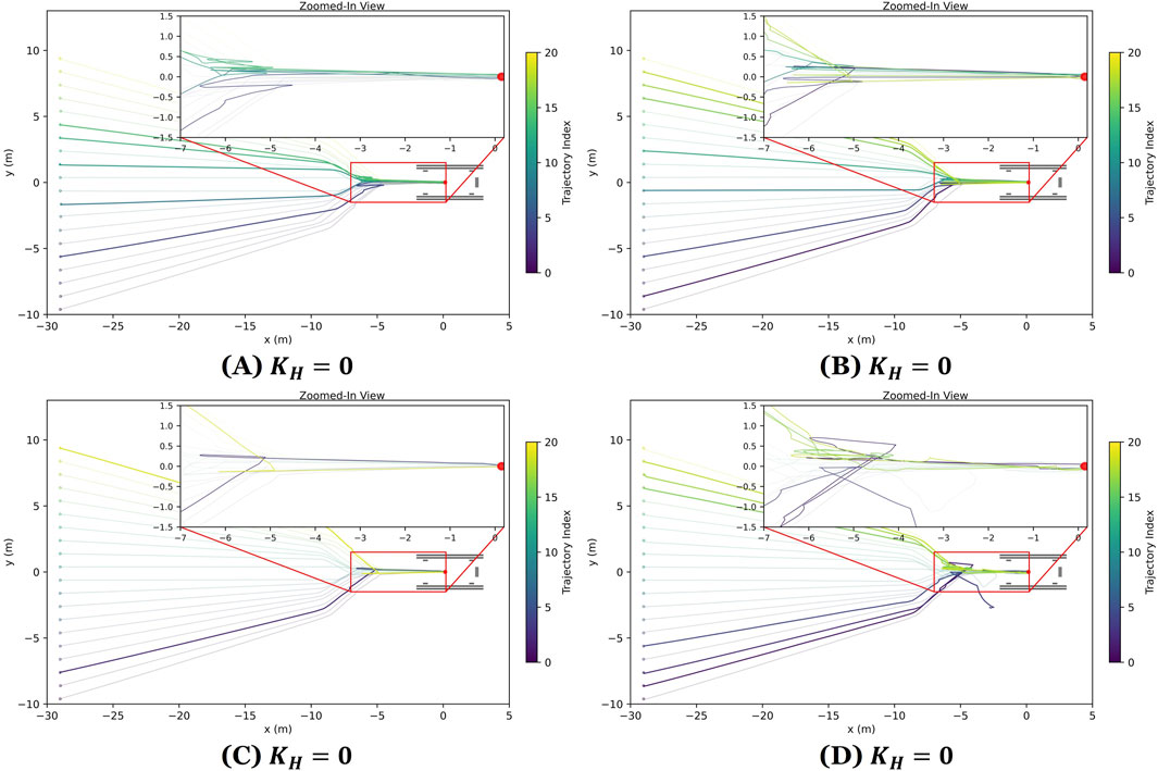 Despite these challenges, the FSM-based control system successfully handled most alignment errors, demonstrating robustness in the presence of moderate to severe environmental disturbances. Figure 11 presents state trajectories for four representative trials. These plots provide valuable insight into the dynamic behavior of an ASV during autonomous loading onto a trailer under varying wave disturbance conditions. The plots show increased oscillations in the ASV’s pose and control signals as wave intensity rises. While the control system remained stable in mild and moderate scenarios, large disturbances introduced substantial deviations that exceeded the system’s ability to compensate.