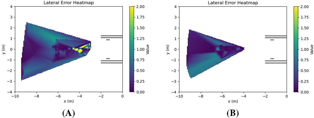 Figure 9 shows heat maps of the lateral error accuracy in scenarios with calm wave disturbance and high wave disturbance. As wave intensity increased, the perception error grew - especially in estimating lateral alignment - lowering the accuracy of the lateral error measurements and contributing directly to the two observed failures. Figure 10 illustrates these failure scenarios. The first failure case is shown in 10 (A). The ASV successfully docked but was misaligned. Due to friction between the hull and the trailer bunks, it was unable to correct its heading and realign after docking, resulting in a misaligned final position. For the second failure case in Figure 10B, the ASV failed to board the trailer entirely. After initially correcting the erroneous lateral error estimate, it encountered the short bunk supporting the bow of the vehicle, causing it to get stuck before completing the docking process. These failures highlight the critical impact of wave-induced perception errors on docking performance.