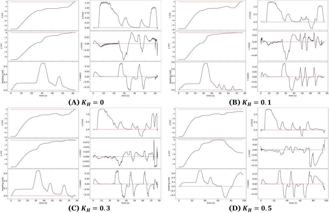 Figure 11. State plots showing ASV pose and control responses during trailer loading under varying wave conditions. (A–C) Successful trials with increasing wave intensity; (D) failed trial under large disturbances. Red lines indicate target values; black lines represent ASV state trajectories.