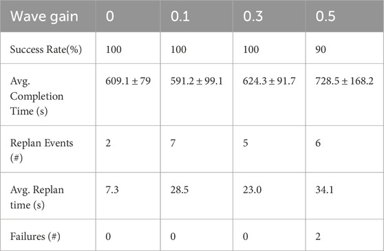 To better understand how wave disturbances affect system performance, we compared success rates, completion times, and the frequency of replanning events across different wave gain levels. The data revealed clear trends: as wave intensity increased, task completion times generally rose, with the most noticeable difference occurring between the low disturbance case