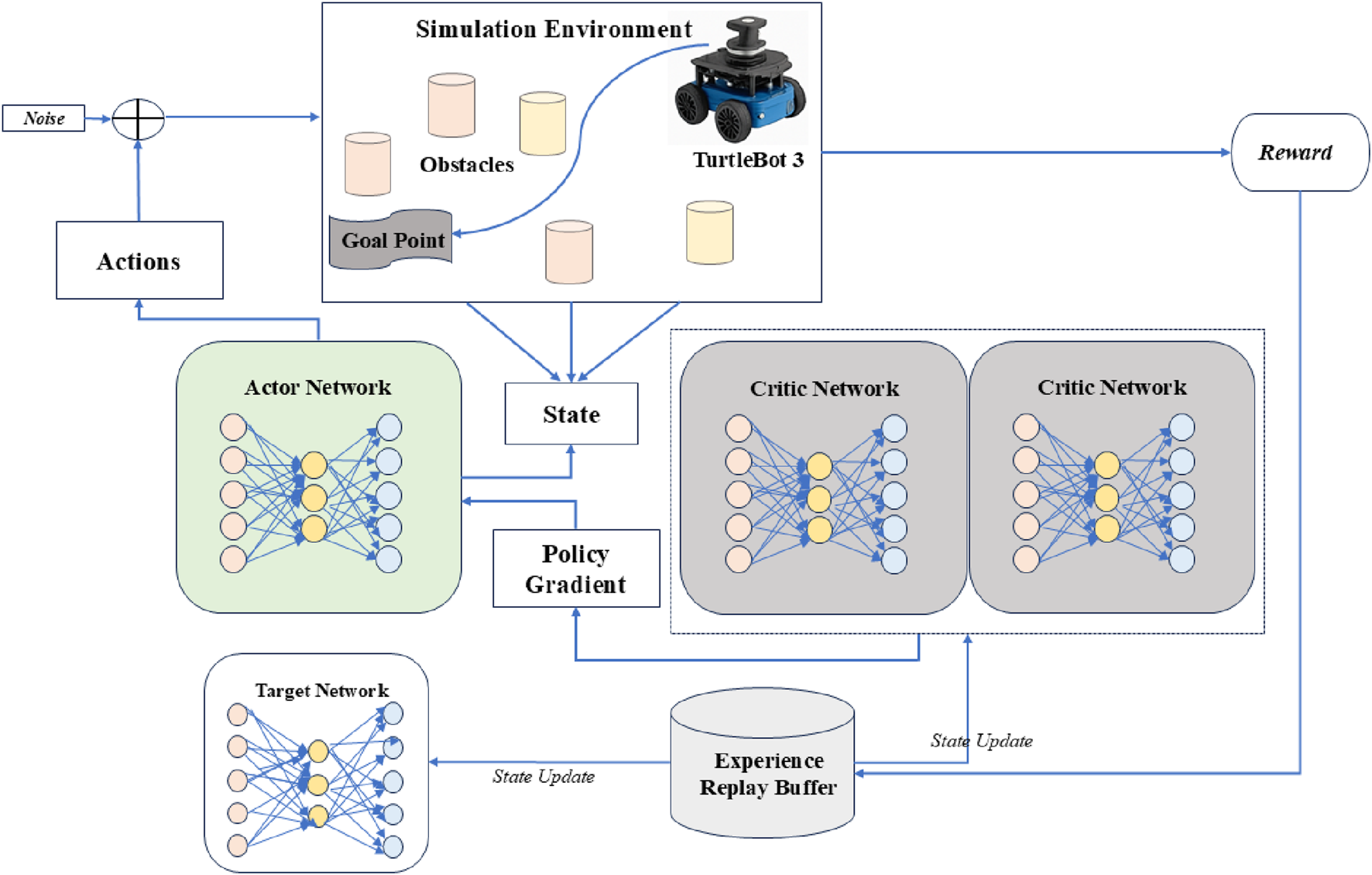 Depending on the type of reinforcement learning, action space varies (Xue et al., 2024). The 360-degree LiDAR captures both static and dynamic obstacles in real time. As moving agents or obstacles enter or exit the path of the mobile robot, the laser scan values update the state representation, enabling the agent to adapt its policy accordingly. This will allow the system to navigate along dynamically changing environments while perceiving time-varying obstacles. However, static structure remains consistent in the state, while moving obstacles alter the state vector across time steps, reinforcing the temporal aspect of learning. For DDPG and TD3, the mobile robot commutes within a continuous action space, and it controls its linear velocity m/s and angular velocity rad/s, allowing for smooth and precise movement. In contrast, DQN employs a discrete action space, restricting the robot to predefined movement commands such as “Move Forward,” “Turn Left,” and “Turn Right,” simplifying decision-making but limiting flexibility in complex navigation scenarios. This modular state-action modeling is essential to enable both fine-grained control for DDPG and TD3 and efficient decision-making in constrained environments for DQN.