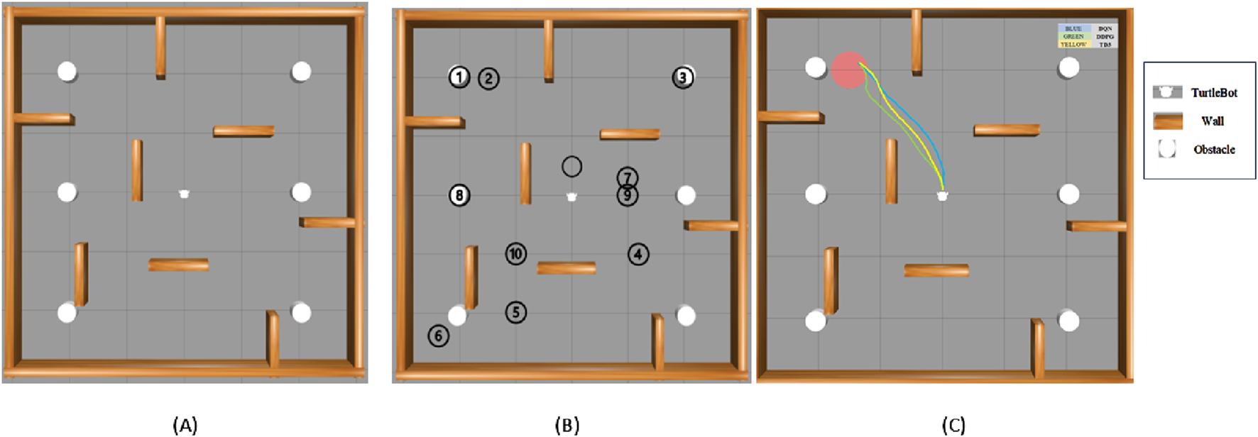 These components will collectively structure the learning signal to ensure a tradeoff between path efficiency, safety, and goal attainment, thereby shaping both the value function and the control policy. The reward values are scaled to balance short-term responsiveness with long-term goal achievement. A pseudo-algorithm (Algorithm 1) shows that these elements taken together guarantee that the robot not only concentrates on promptly attaining the goal but also on preserving an efficient and secure path. This reward function plays a central role in shaping the learned behavior of the agent by implicitly influencing the Q-function in DQN and the state value function in DDPG and TD3. The individual components of reward are carefully designed to balance goal seeking, safety, and motion smoothness. For instance, ensures continuous motivation towards the goal, whereas performs the duty of sharp penalty imposition to ensure collision avoidance. The angular and linear velocity penalties act as regularization terms to promote stable control, and calculates rewards based on goal state achievement.