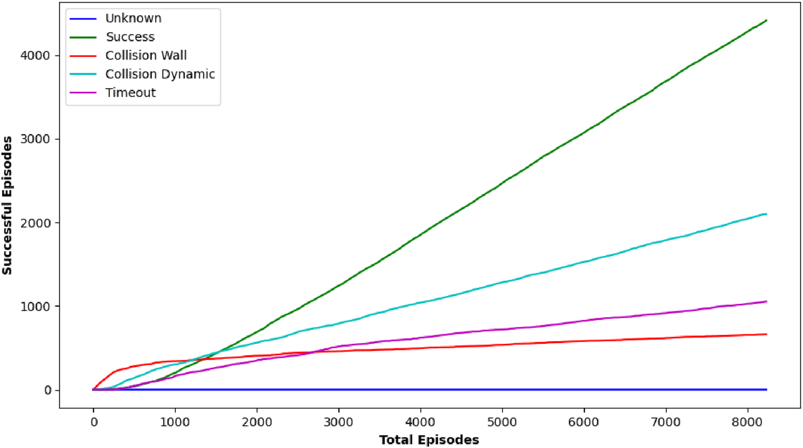 This structure ensures that the agent will not only learn to reach the goal position efficiently but also internalize policies that are safe and feasible dynamically. Our reward-shaping strategy is consistent with reinforcement learning theory, where reward design directly determines the optimal learned policy. This also aligns with the findings from Tutsoy and Brown (Tutsoy and Brown, 2015) that demonstrate piecewise-linear control objectives can be embedded into the reward structure to ensure convergence and desirable control behaviors. Our framework leverages this principle by ensuring that positive rewards drive goal-seeking, while heavy obstacle penalties reinforce collision avoidance, resulting in well-shaped policies capable of dynamic crowd navigation.
