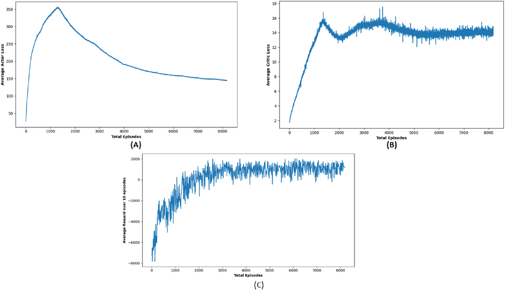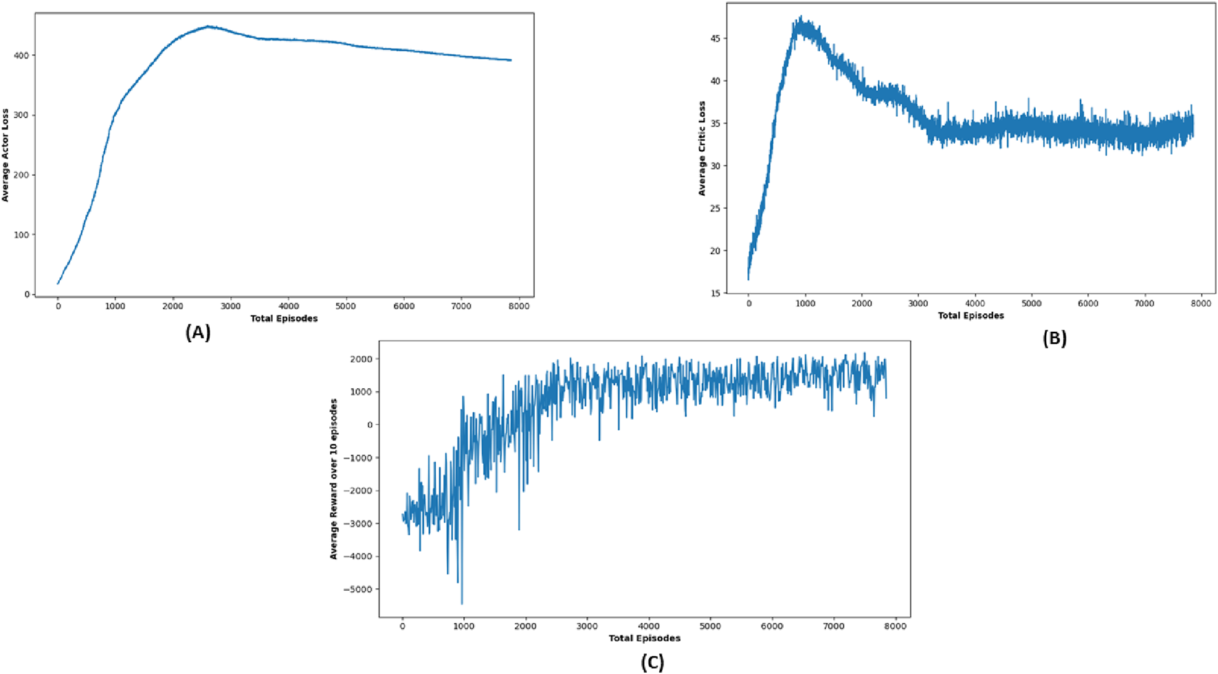 The article (Kargin and Kołota, 2023) applied the DDPG algorithm to address the complex control challenges of continuum robots that belong to a class of robots that are highly flexible and are characterized by a continuous structure, allowing high dexterity in constrained or complex environments. However, the control of these robots modulates unique challenges. This is mainly due to the continuous nature of their movements and highly nonlinear kinematics, which contrast with the traditional robotic systems with discrete joints. In (Lee et al., 2024), the authors explored the integration of Digital Twin technology with DDPG to enhance communication efficiency in UAV networks. It demonstrated that the approach maximizes sum-rate performance effectively, highlighting the potential of the algorithm’s application in complex communication scenarios. In (Liu et al., 2024), Liu et al. introduced a learning method, applying DDPG to navigate dynamic environments. The study illustrates TD3’s proficiency in autonomous control by addressing issues such as dynamic path adjustment and obstacle avoidance. DDPG’s capability in dynamic robotic control is shown in the study, and the challenges, such as obstacle avoidance and dynamic path navigation, are addressed.