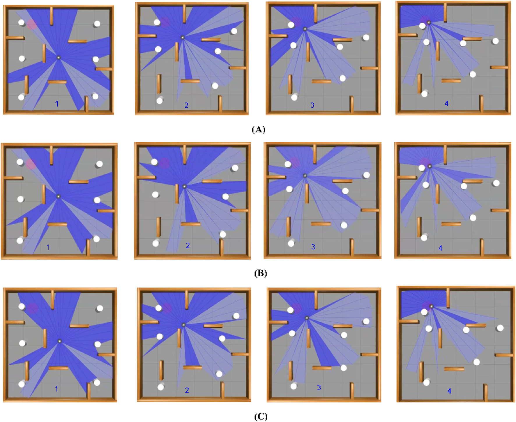 The reward function is designed to encourage efficient and safe navigation while penalizing undesired behaviors. It consists of multiple components that guide the learning process by reinforcing positive actions and discouraging negative ones. The function (Equation 10) begins by calculating several individual reward components based on the robot’s orientation, movement actions, proximity to the goal, and obstacle avoidance. For example, is calculated as the negative absolute value of the goal angle , which means that any deviation from the desired orientation results in a penalty. This encourages the robot to maintain a trajectory aligned with the target direction. Similarly, penalizes large angular velocities by subtracting the square of the angular action, thus discouraging erratic rotational movements that could destabilize the robot’s path.