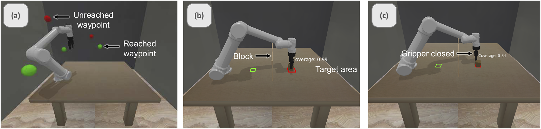 Single arm training tasks: (a) target reaching, (b) pick-and-place, and (c) pushing.