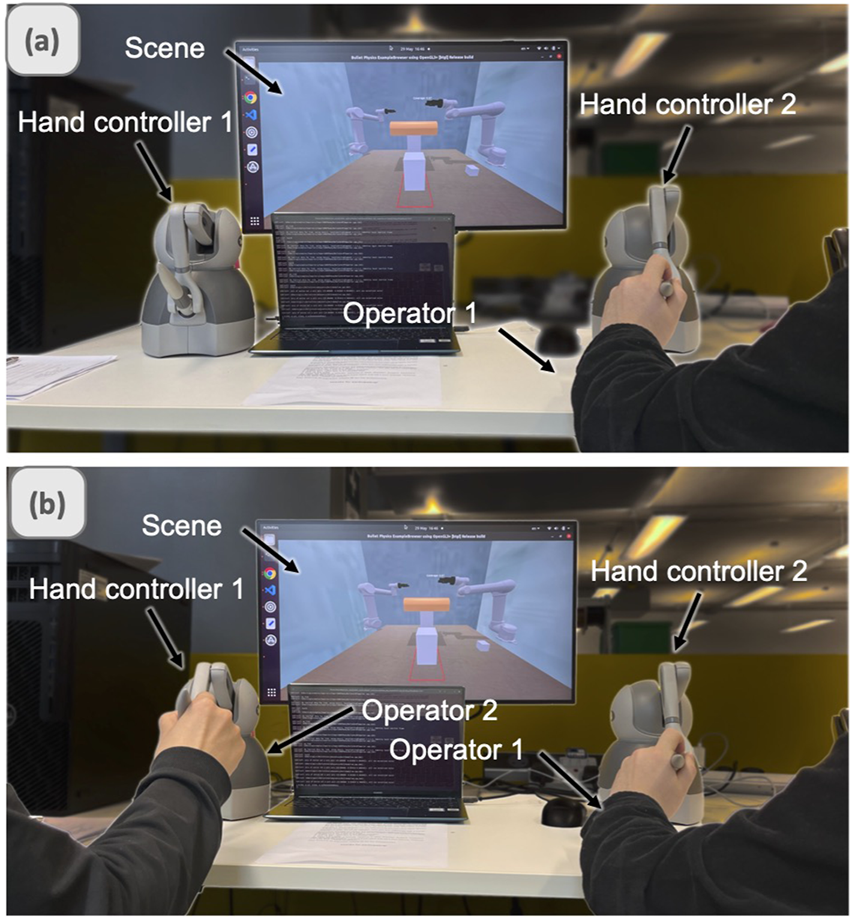 Experimental setup for bimanual teleoperation: (a) SPB and (b) Dyadic configurations.