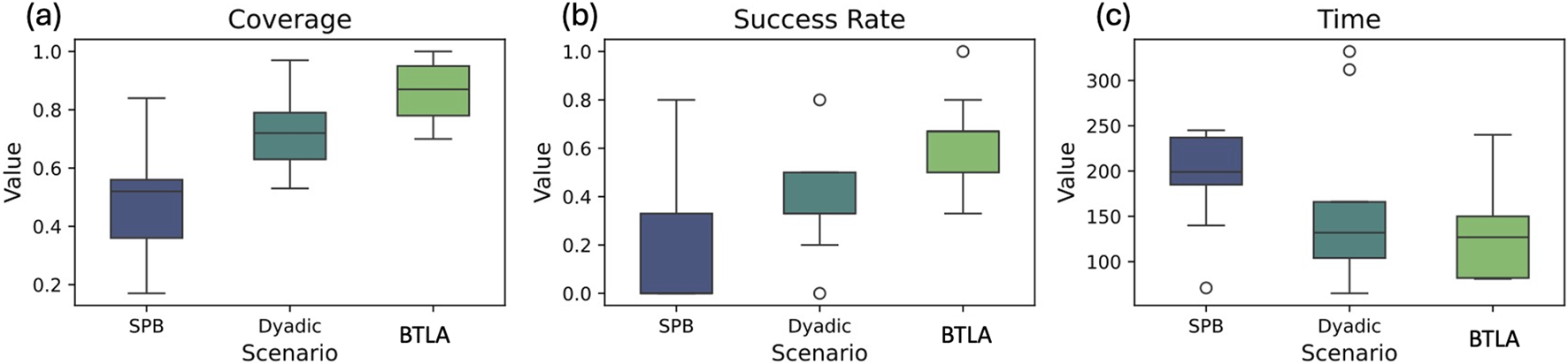 Box plots for performance (a) coverage , (b) success rate , (c) time among all subjects for three experimental scenarios SPB, Dyadic, and BTLA.