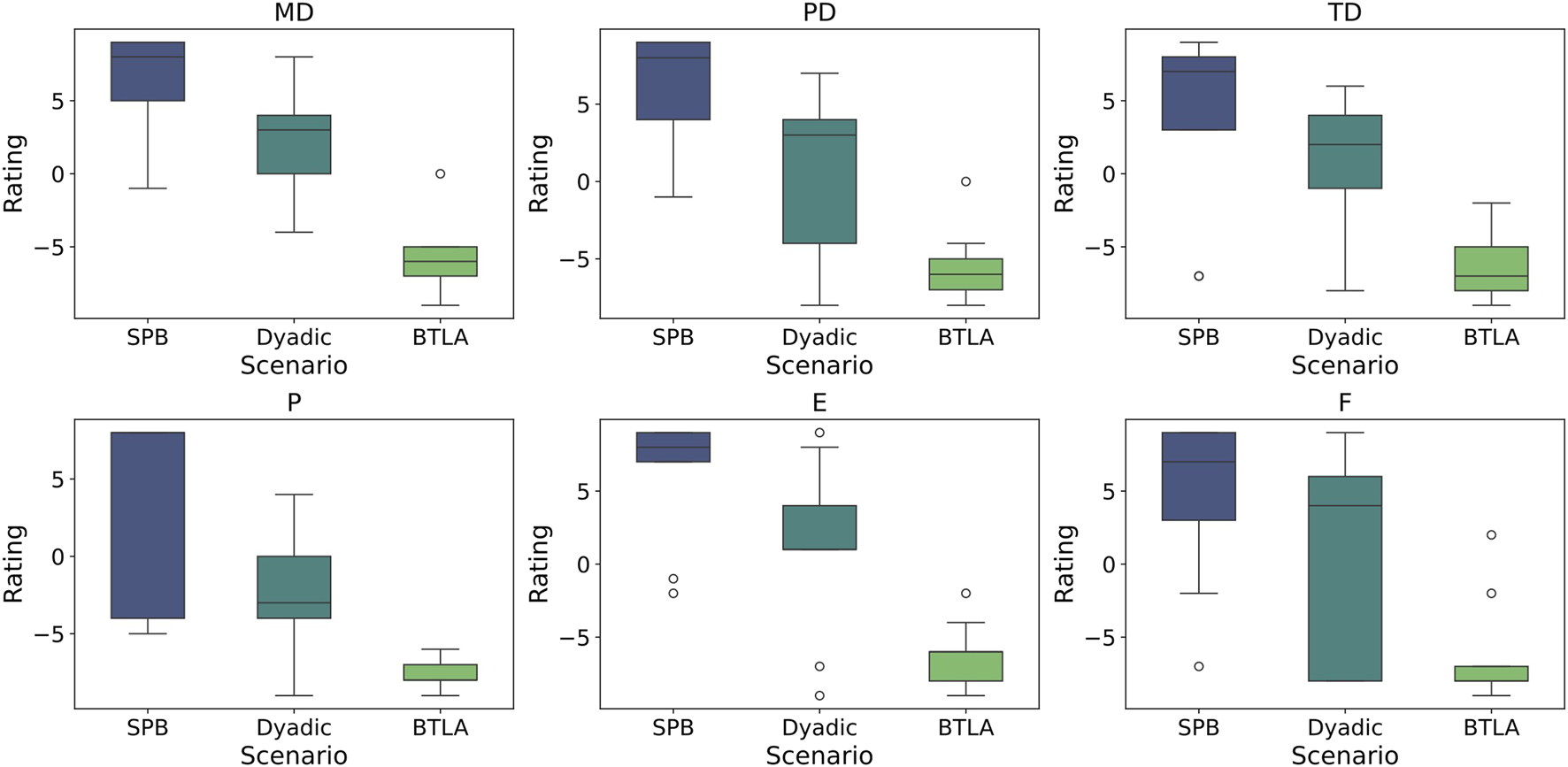 Boxplots for NASA-TLX results among all subjects for three experimental patterns: SPB, Dyadic, and BTLA, respectively. Rated aspects from NASA-TLX: mental demand (MD), physical demand (PD), temporal demand (TD), performance (P), effort (E), and frustration (F). (all metrics: ).