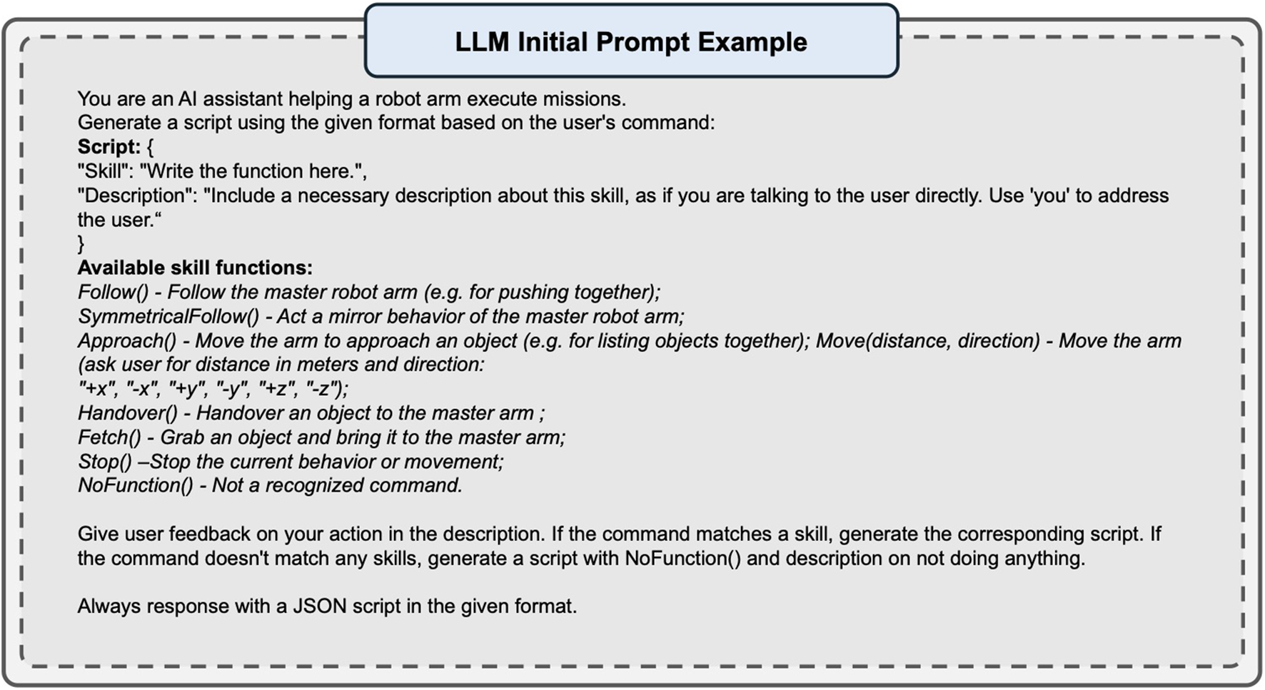 For realistic human voice interactions, we adopted the OpenAI Whisper model for speech-to-text and text-to-speech (TTS) tasks. We selected GPT-3.5-turbo as our primary LLM after comparative testing with GPT-4 and Mistral-7B-OpenOrca showed similar performance in command interpretation but faster response times with GPT-3.5-turbo. Our LLM prompt employs a structured three-component design: role definition, skill specification, and JSON response formatting. The prompt explicitly defines available skills (e.g., Follow(), Fetch(), SymmetricalFollow()) and requires standardized JSON responses such as “Skill”: “Follow()”, “Description”: “I’ll follow your arm movement to help push the object together.” This ensures consistent command interpretation and seamless integration with our control pipeline. The complete prompt structure is detailed in the appendix (Figure 9).