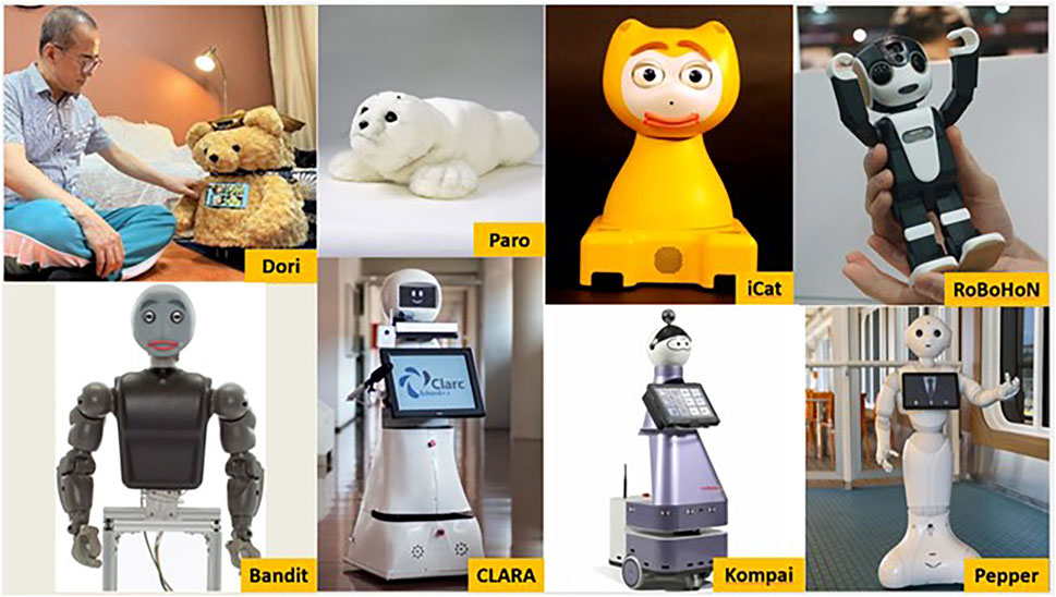 One class of assistive robots is socially assistive robots (SARs), which incorporate social interactions in the assistance they provide (Feil-Seifer and Matarić, 2005). The goal of SARs is to create close and effective interactions with a human user to provide assistance to users and achieve measurable progress in convalescence, rehabilitation, learning, and other daily activities (Feil-Seifer and Matarić, 2005). The “socialness” of SARs is not well defined in the existing literature but has been attributed to the robot’s capability to produce speech and physical gestures and to receive direct input from a user (Feil-Seifer and Matarić, 2005). This definition is limited in that it fails to include crucial elements of social interactions, such as following sociocultural norms, being socially aware of their environment, or displaying social intelligence (i.e., thoughts and feelings; Henschel et al., 2021). Figure 1 presents examples of SARs where such elements have been incorporated. The technological components of SARs has advanced over time. For instance, the emergence of advanced sensors, longer battery life, rapid prototyping, multimodal communication applications, actuation power, generative AI, image processing and pattern recognition capabilities in robots (Rogers et al., 1998; Tapus et al., 2007; Ishak, 2020; Gongor and Tutsoy, 2025) have expanded the capabilities of SARs to support older adults.