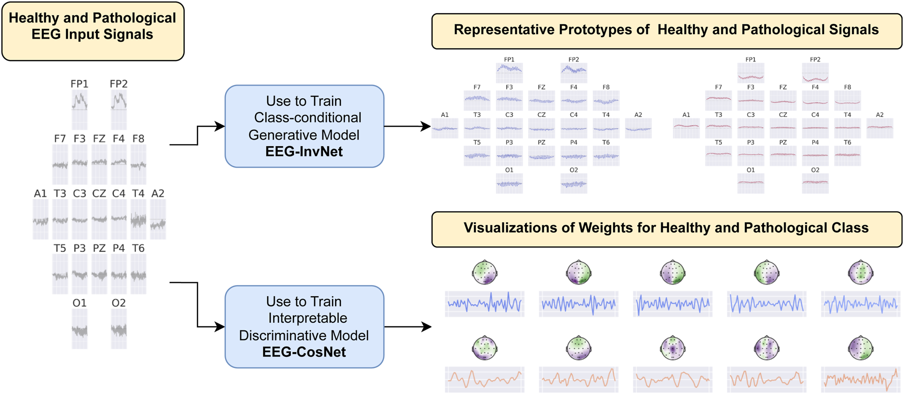 Overview of the interpretability approaches. We developed two methods for investigating EEG features learned by neural networks in the task of pathology decoding. In the first approach, we train a class-conditional generative invertible network, EEG-InvNet, and use it to generate prototype EEG signals for the healthy and pathological classes. In the second approach, we train a compact, interpretable discriminative network, EEG-CosNet, and visualize its learned discriminative weights for the two classes.