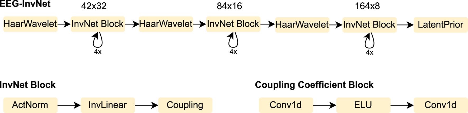 EEG-InvNet architecture. Our EEG-InvNet architecture consists of three stages operating at progressively lower temporal resolutions. The input comprises 2 seconds of EEG from 21 electrodes sampled at 64 Hz, yielding an input of size . The data are downsampled using Haar wavelets to sizes , , and across the three stages. Each stage consists of four blocks, with each block containing an activation normalization layer, an invertible linear layer, and a coupling layer. The activation normalization and invertible linear layers operate on the channel dimension, applying the same transformation across all channels at each time point of the feature map. The coupling layer consists of two convolutional layers with an exponential linear unit (ELU) activation in between.