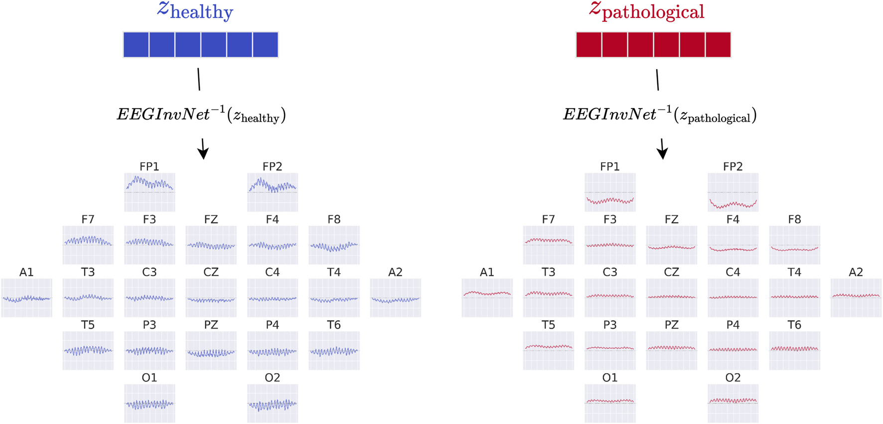 In our first visualization, we show the inputs resulting from inverting the means of the gaussian distributions for each class (see Figure 3). For example, the healthy-class prototype is obtained by inverting the Gaussian mean using the invertible network EEG-InvNet:These visualizations can be interpreted as prototype examples of each class. However, individual features within a prototype should be interpreted with caution. For example, if a prototype contains a prominent alpha-band oscillation at one electrode, this does not imply that the oscillation is independently predictive of the class, since other features may also contribute. Nevertheless, such prototypes can already suggest potential discriminative features for further investigation.