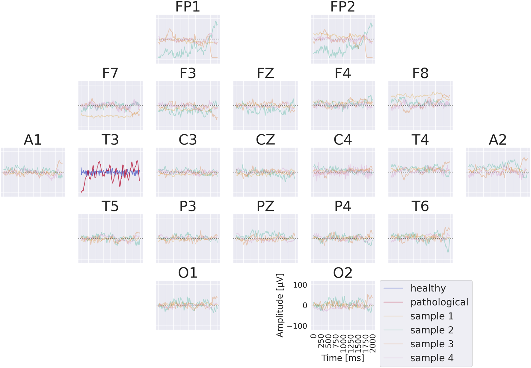 EEG-InvNet per-electrode class prototypes. Per-electrode prototypes are obtained by optimizing synthetic class-specific signals for a single electrode to yield high predicted class probabilities, irrespective of the signals at other electrodes. Signals at the remaining electrodes are sampled from the training data. In the example, prototypes for electrode T3 are learned for both the healthy and pathological classes, with four sampled signals shown for the remaining electrodes. In practice, a much larger number of samples is used. Class probabilities are marginalized over the non-optimized channels, as described in the text.