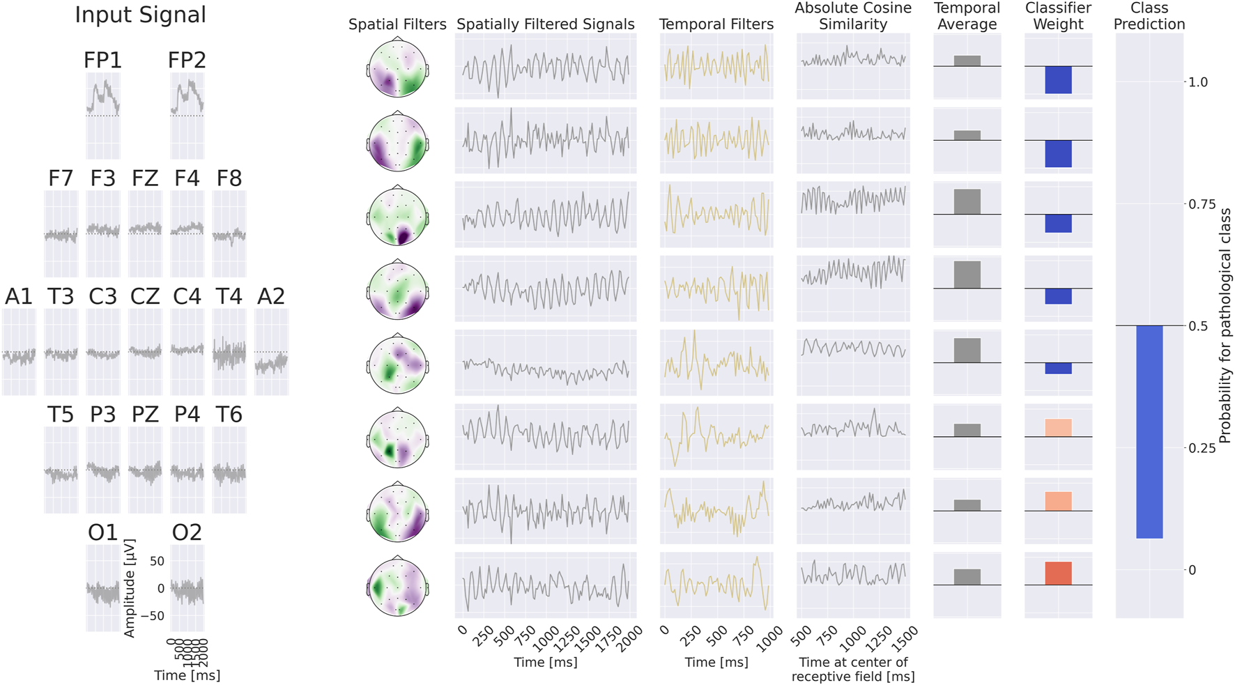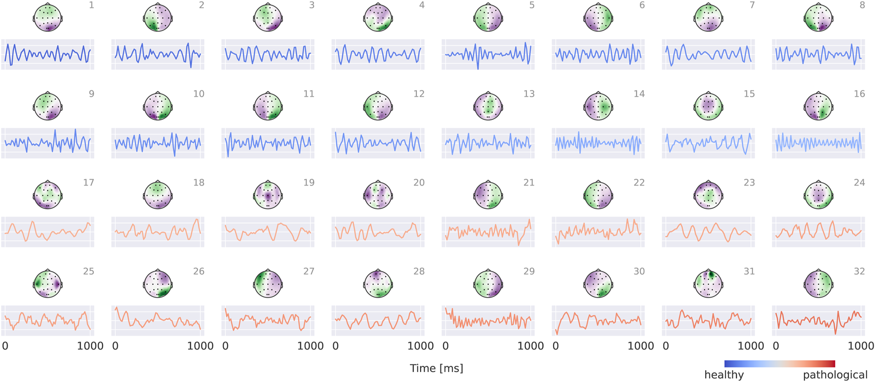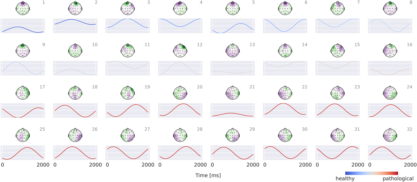 Visualization of the interpretable EEG-CosNet trained to mimic the EEG-InvNet. Scalp plots display the spatial filter weights after transformation into interpretable patterns, and the corresponding convolutional temporal filters are shown below each scalp plot. We display the 16 filters most strongly associated with the healthy class and the 16 most strongly associated with the pathological class (see Supplementary Material for the full network). The color coding of the temporal signals represents the linear classifier weights, transformed to patterns (see Section 2.5 for details). Filters are ordered according to these classifier weights. Note that the polarity of scalp plots and temporal filters is arbitrary, since absolute cosine similarity is applied to the spatially filtered and temporally convolved signals.