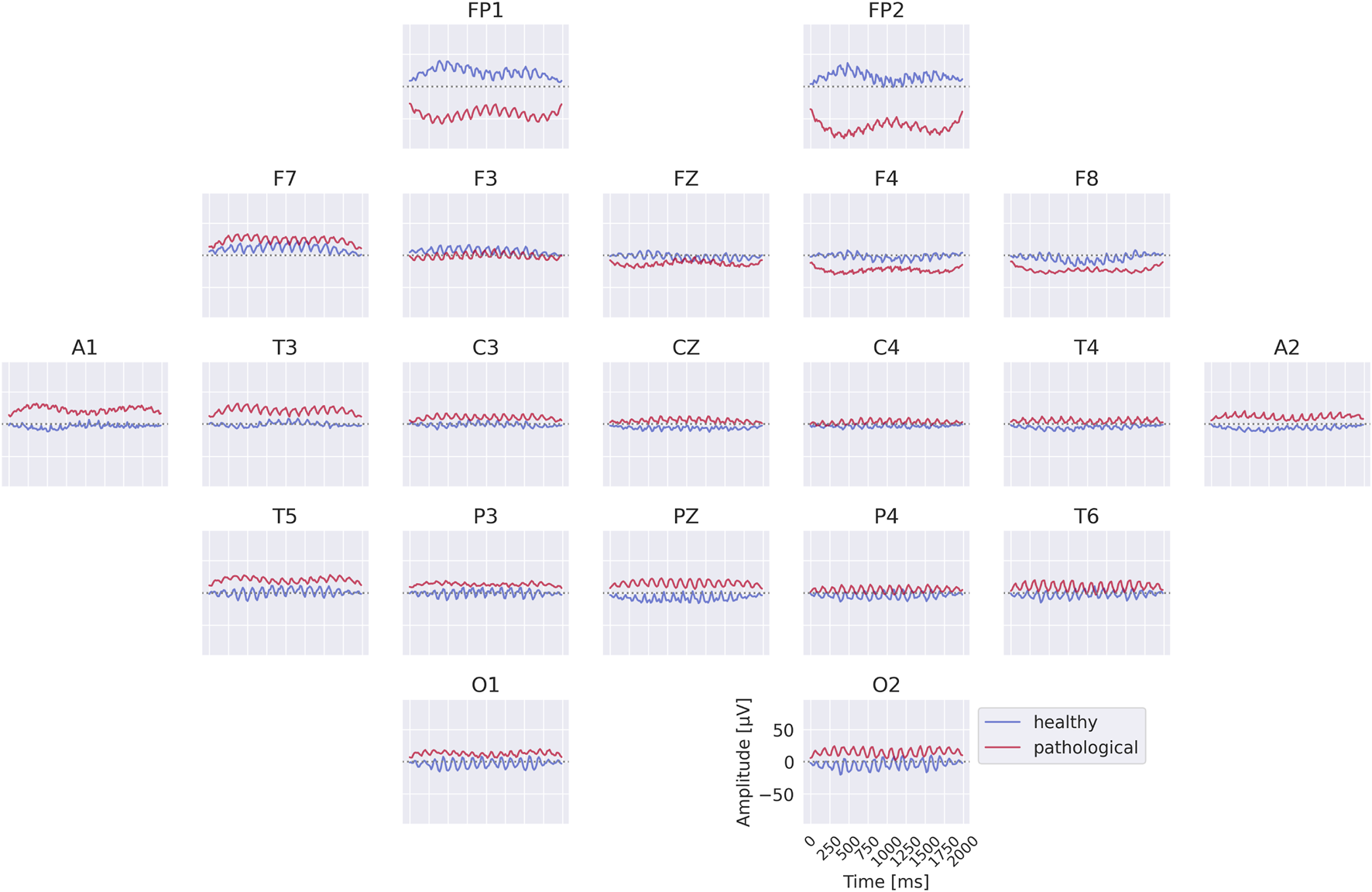 Learned class prototypes from EEG-InvNet. Class prototypes are generated by inverting the learned means of the class-conditional Gaussian distributions from latent space back into input space using the EEG-InvNet trained for pathology decoding (see text for details). The prototypes reveal distinct oscillatory patterns, including alpha oscillations that differ between the two classes. For the healthy class, alpha activity shows larger amplitudes over occipital electrodes, particularly O1, compared to other sites. Interestingly, clear mean differences are apparent at frontal electrodes, highlighting unexpected spatial patterns that distinguish the two classes.