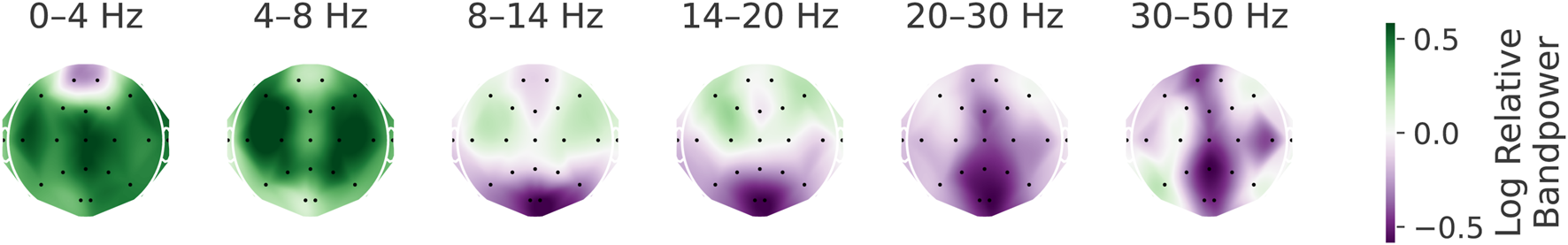 Visualization of relative log-bandpowers. Scalp plots of the logarithm of the relative bandpower between pathological and healthy signals across different frequency bands. Note that the spatial patterns are consistent with the findings from EEG-InvNet and EEG-CosNet visualizations.