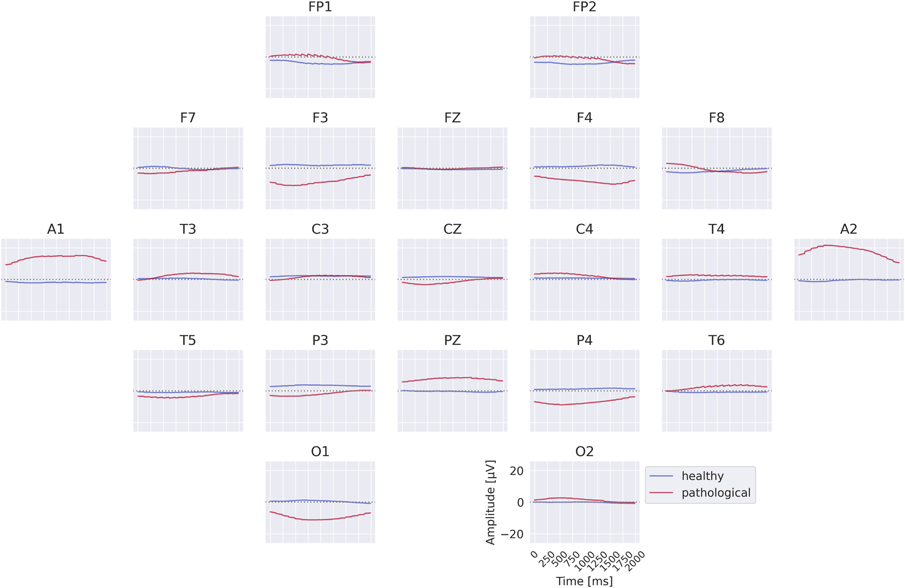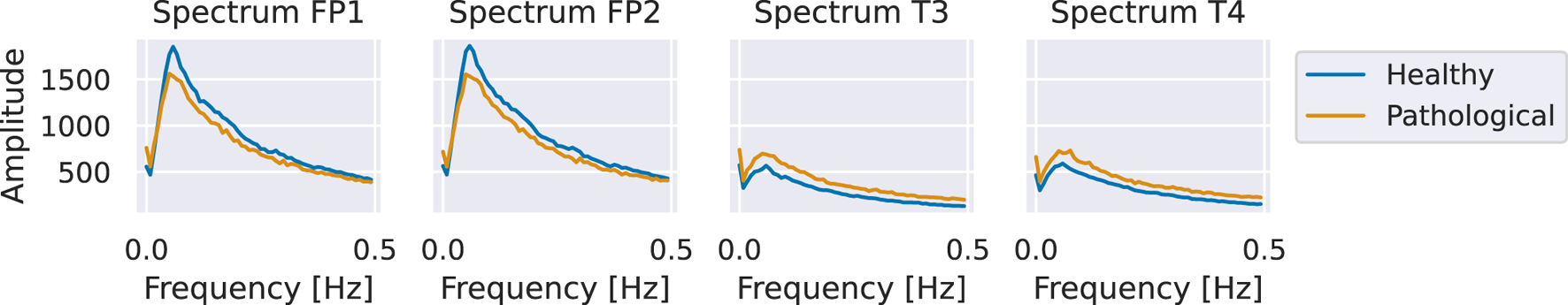 One surprising observation from the visualizations is the difference in sub-delta frequency components ( Hz) between the two class prototypes. For example, the substantially different mean amplitudes in the prototypes at electrodes FP1 and FP2 suggest that very low-frequency activity differs between the two classes at these sites. However, given the inherent limitations of interpreting class prototypes, one cannot be certain about the precise relationships between EEG activity and class membership solely from these plots. Nevertheless, these observed differences motivated a more detailed investigation of the sub-delta frequency range.