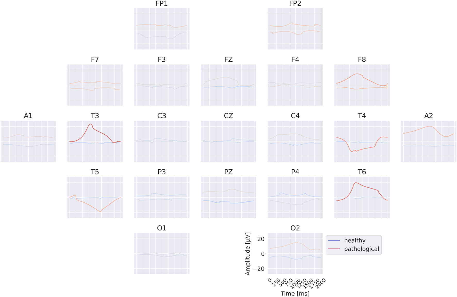 The per-electrode prototypes reveal distinct features learned for the two classes (see Figure 7). Pathological prototypes show large-amplitude low-frequency oscillations, for example, at T3 and T4, consistent with the well-known biomarker of temporal slowing in pathology. In contrast, healthy prototypes frequently display alpha-band activity, such as at C4 and T6. We also again observe differences in the sub-delta range (0.5 Hz), for instance in the mean values at FP1 and FP2 between healthy and pathological prototypes. Importantly, for several electrodes it was not possible to synthesize a signal that is clearly class-indicative independent of activity at other electrodes. This suggests that the EEG-InvNet did not learn strong class-predictive electrode-specific features at those electrodes.