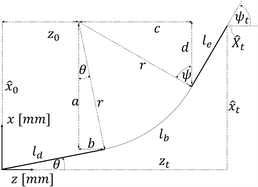 ![Graph depicting a segmented curve with variables labeled. Axes are marked as \(x [mm]\) and \(z [mm]\). Key segments and angles include \(l_d\), \(l_e\), \(\theta\), \(\psi_t\), and \(r\). Distances \(a\), \(b\), \(c\), and \(d\) are noted, along with coordinates \(\hat{x}_0\), \(z_0\), \(\hat{x}_t\), and \(z_t\). Geometric relationships are illustrated using dashed lines and angle arcs.](https://www.frontiersin.org/files/Articles/1627688/xml-images/frobt-12-1627688-g004.webp)