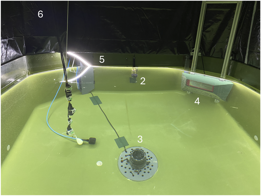 To stimulate positive welfare in the fish, the tank was colored a dark green believed to not adversely impact salmon behavior or welfare. This also provided a dark backdrop for the fish that resembles the color of deep water beneath a fish farm when perceived from within a commercial cage. Furthermore, to ensure a clean environment for the fish, all sensing technologies and inlet pipes were concealed from the fish when possible. The intention of this measure was to reduce the potential impact of external factors on the fish, thereby facilitating an environment better suited for experiments targeting responses to specific stimuli.