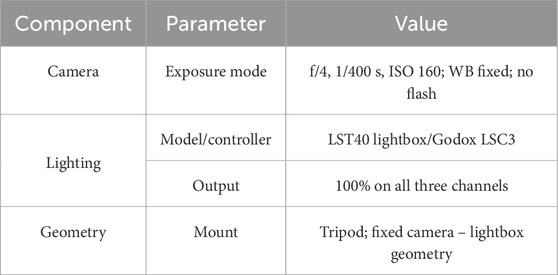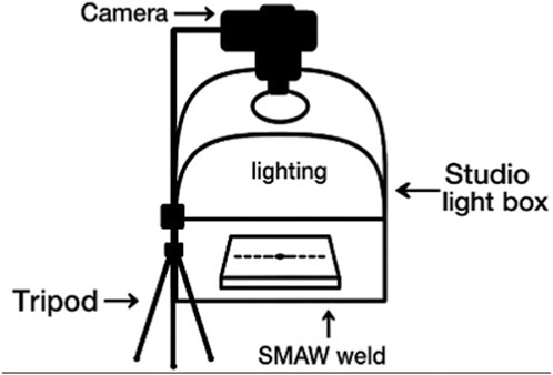 The visual documentation of each weld bead was carried out using a Canon EOS Rebel T8I (24.1 MP) and a Sigma 105 mm macro lens on a tripod. The camera operated in manual exposure at f/4, 1/400 s, and ISO 160, with no flash and fixed with white balance. Illumination was provided by a Godox Triple-light LED Mini Photography Studio (LST40) driven by a Godox LSC3 three-channel controller, with all three channels set to 100% output; camera and lighting geometry were held constant across sessions, while illuminance at the weld surface (lux) was not instrumented. Figure 1 and Table 1 summarize the light-box configuration and geometric setup used throughout the experiments.