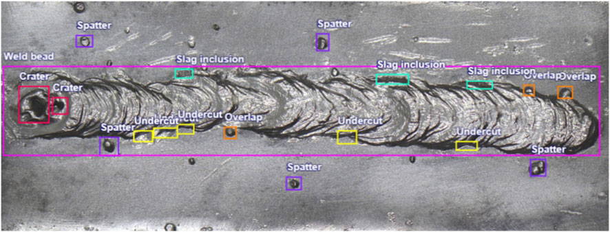 Annotation then proceeded in pairs (two annotators per pair). Within each pair, the annotator generated draft labels and then resolved discrepancies by discussion to produce pairwise consensus labels, which constitute the released dataset. Labels were created manually using open-source annotation software, following the discontinuity labeling protocol. Because labels were produced by pairwise consensus and pre-consensus disagreements were not logged, we do not report formal inter-annotator agreement for this release; future updates may include a stratified IAA on an independently re-annotated subset. We did not log pre-consensus disagreements or compute formal inter-annotator agreement metrics for this release. An example of a labeled weld bead image with annotated discontinuities is shown in Figure 2.