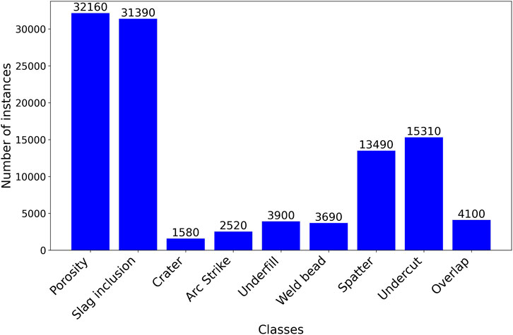 Following the data augmentation, 108,140 labeled instances were obtained across nine classes: eight different discontinuity types and the weld bead. The distribution of instances per class is shown in Figure 3, highlighting a higher occurrence of porosity and slag inclusions, followed by undercut, spatter, and weld bead. Less frequently annotated classes, such as crater, arc strike, and underfill, represent more subtle or less frequent discontinuities.