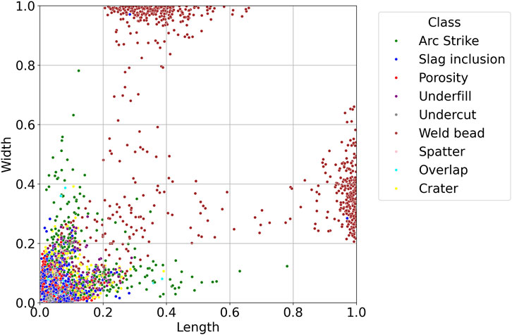The labels' spatial characteristics were also examined. Figure 4 shows the relative bounding box dimensions normalized with respect to image size. Weld beads tend to occupy a larger spatial footprint, whereas discontinuities such as porosity, slag inclusions, and craters are typically smaller and more compact. This variation has implications for the model’s detection sensitivity across classes with different aspect ratios and scales.