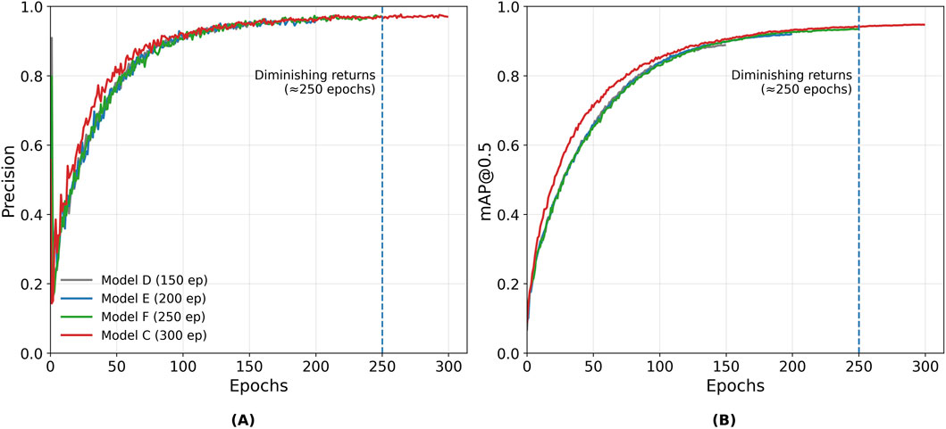 Figure 6. Evolution curves for YOLOv7 models. (A) Precision curve (B) mAP@0.5 curve. Validation metrics were computed using EMA weights maintained during training, and the dashed line at 250 epochs highlights the onset of diminishing returns in validation performance.