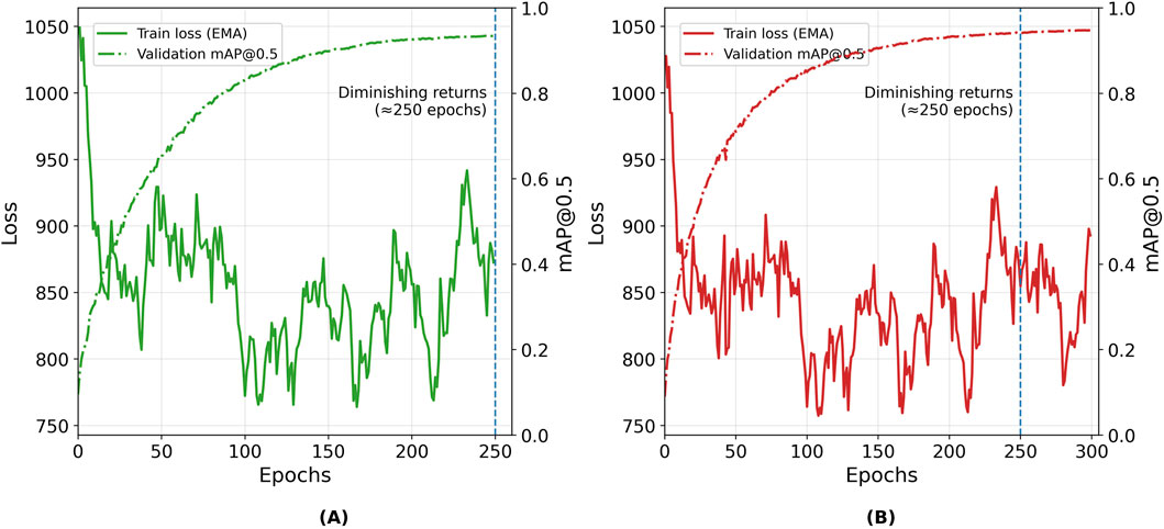 Figure 7. Training box-loss (solid) and validation mAP@0.5 (dashed) versus epochs for YOLOv7-p5 models: (A) Model F (250 epochs) and (B) Model C (300 epochs). The dashed line at 250 epoch indicates the saturation point in learning.