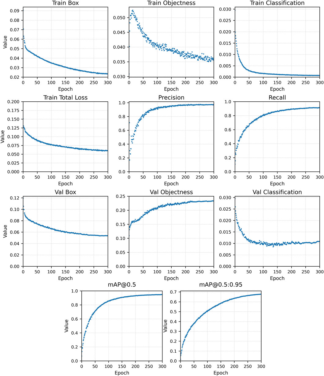 The precision and mAP evolution curves shown in Figure 6 were obtained from the validation subset at regular checkpoints using the exponential moving average (EMA) weights maintained during YOLOv7 training (Wang C. Y. et al., 2022). The EMA mechanism smooths short-term oscillations in the model parameters, providing a clearer view of convergence behavior and supporting a consistent assessment of stability and diminishing returns across epochs (Morales-Brotons et al., 2024). The curves show that performance improvements plateau after approximately 250 epochs, marking the onset of diminishing returns, where further training increases computation cost without yielding meaningful accuracy gains.