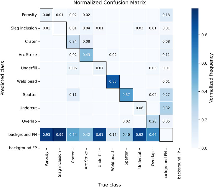 The confusion matrix presented in Figure 9 shows that the test subset background false positives and false negatives dominate the overall error distribution rather than cross-class confusions. False positives are concentrated in spatter and undercut, often triggered by reflective textures or weld toe irregularities. False negatives occur mostly in porosity, slag inclusion, underfill, and undercut, which have a small size and low visual contrast. Additionally, cross-class confusions appear sporadically between crater-arc strike and undercut-overlap, where similar geometry and adjacency effect can cause NMS suppression of valid detections.