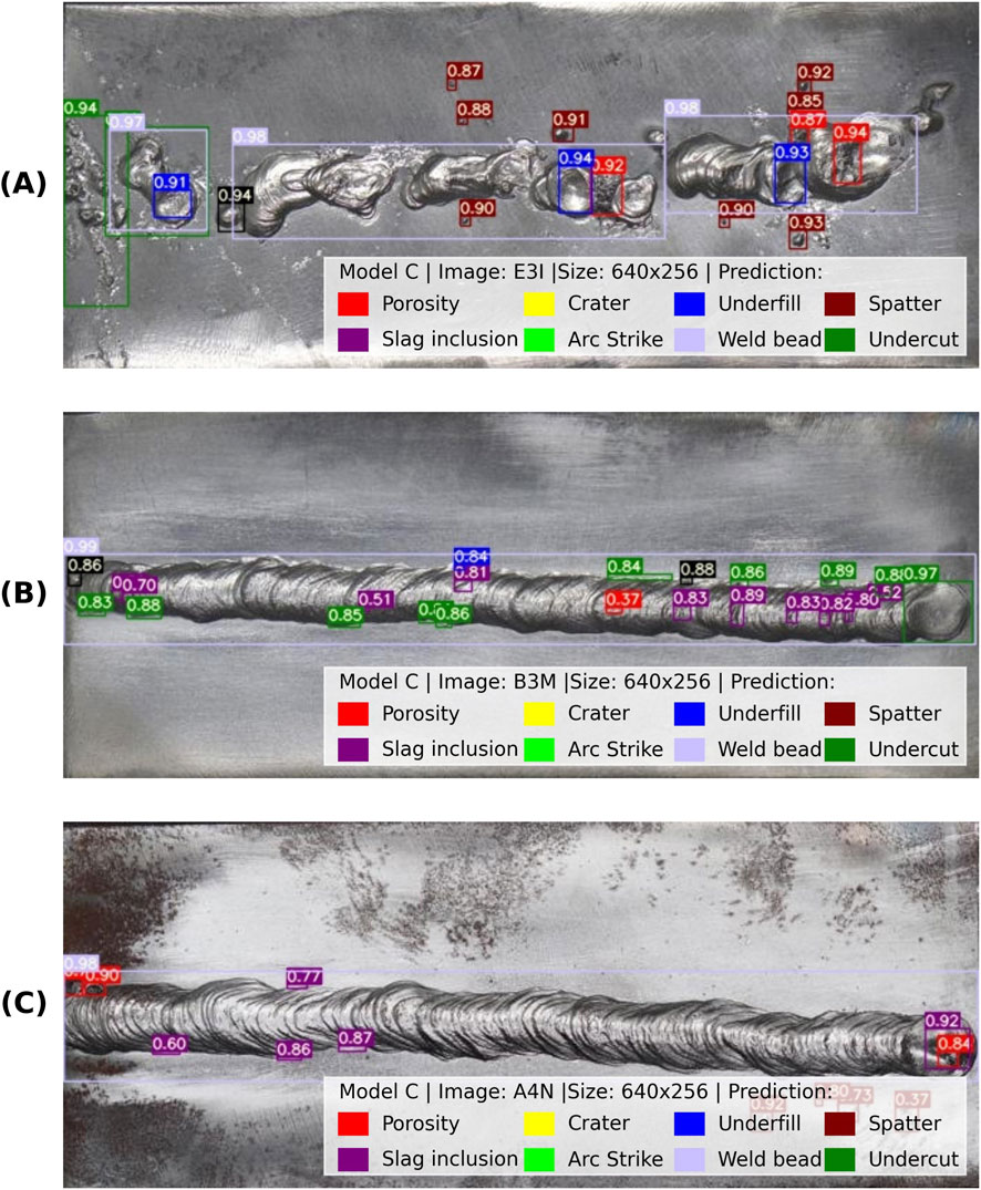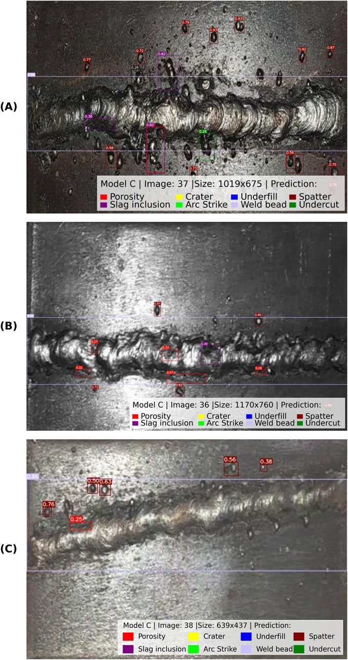 Figure 10 presents representative results for each operator category. Model C correctly identified multiple discontinuity types across all examples, including porosity, slag inclusion, arc strike, spatter, underfill and weld bead geometry. The bounding boxes were closely aligned with the ground truth locations, and confidence scores were high even in more challenging cases, such as irregular weld patterns typical of less experienced welders. Figure 10A shows prediction for a weld bead produced by an engineering student, characterized by irregular geometry and abundant surface discontinuities. Figure 10B shows a weld bead produced by a general welder, exhibiting moderate discontinuity occurrence. Figure 10C shows a weld bead produced by a certified welder, where the model correctly detected the nearly discontinuity-free surface region. Notably, in Figure 10C, the model shows its ability to detect discontinuities and recognize discontinuity-free regions accurately. This dual capability is essential for practical automated inspection systems, ensuring that discontinuity detection and weld quality verification are reliable.