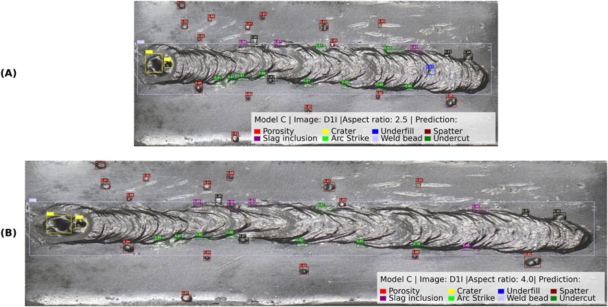 The model detected multiple discontinuities in both cases, including porosity, slag inclusion, underfill, crater, arc strike, and weld bead geometry. The bounding boxes remained consistent, and the confidence score stayed within acceptable margins. However, a slight reduction in confidence was noted in the 4.0:1 aspect ratio image, particularly for small discontinuities such as underfill and slag inclusion, dropping to 0.66 in isolated cases.