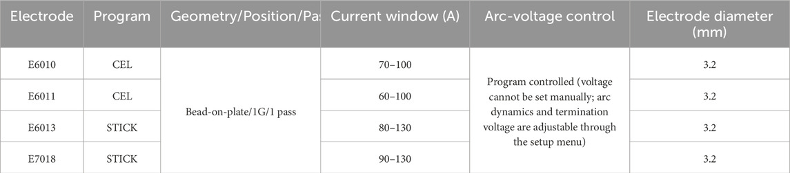 SMAW beads were produced using the Fronius Transpocket 180 power source’s preset programs, selected by coating family: CEL for cellulosic electrodes (E6010, E6011) and STICK for low-hydrogen/rutile electrodes (E7018, E6013). All deposits were bead-on-pate in the flat (1G) position with a single pass per electrode. The current window applied was E6013: 80–130 A, E7018: 90–130 A, E6010: 70–100 A, and E6011: 60–100 A; the power source automatically regulated arc voltage according to the selected program (no manual voltage setpoint). Travel speed was operator-controlled and not instrumented. Because our focus is on surface discontinuities, no joint preparation was used (bead-on-plate only); thus, lack of fusion effects tied to joint geometry are not confounders. Table 2 summarizes the SMAW setup by electrode.