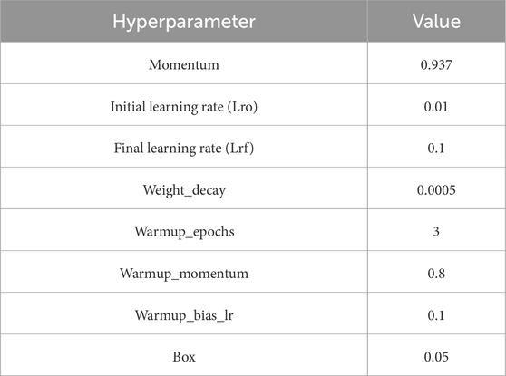 Training parameters followed the recommended YOLOv7 configuration (Wang C. Y. et al., 2022), with minor adjustments to account for dataset size and class distribution. The main hyperparameters, including learning rate schedules, momentum, weight decay, and warm-up settings, are summarized in Table 3. Default values were confirmed to provide stable convergence in short validation trials, and no exhaustive grid search was performed due to the dataset size and available computational resources. Each training session was monitored throughout its epochs to evaluate model behavior, including loss evolution, prediction accuracy, and generalization capability. These evaluations were performed by tracking detection metrics such as precision, recall, and mean average precision, discussed in Section 2.11.