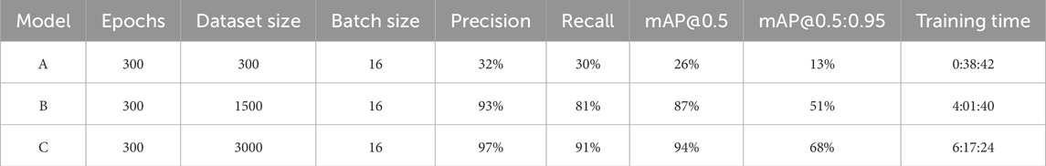 Additionally, a well-defined increase in training time was observed with a larger dataset. Training the model with 300 images required approximately 40 min, whereas training with 1500 images extended to about 4 h, and training with 3000 images took more than 6 h. This behavior shows the computational cost associated with dataset scaling, which must be considered when using environments with limited hardware resources or strict training time constraints.