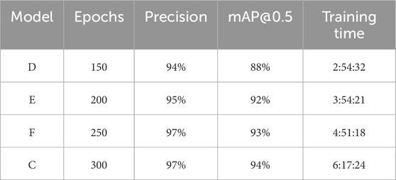As shown in Table 5, Model F (250 epochs) and Model C (300 epochs) achieved the highest validation performance, both exhibiting stable convergence and no overfitting. Model F reached precision = 97% and mAP@0.5 = 93% with a total training time of 04:51:00, whereas Model C required 06:17:00 to complete 300 epochs and improved mAP@0.5 by only one percentage point. These results confirm that extending training beyond 250 epochs yields limited accuracy gains relative to the increase in computational cost.