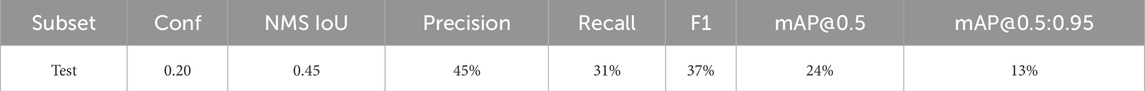 In this study, we set the Non Maximum Suppression (NMS) IoU to 0.45, following the standard YOLOv7 implementation defaults and prior YOLO-style practice (Gählert et al., 2025; Wang C. Y. et al., 2022; Liu et al., 2023), with only the confidence threshold being tuned on the validation subset. The confidence threshold was swept from 0.05 to 0.5 in increments of 0.5, and the operating point was selected by maximizing macro F1 on the validation subset. This procedure yielded confidence = 0.20. The selected thresholds were then fixed and applied once to the test subset for final reporting. Alongside threshold-dependent metrics like precision and recall, it is reported threshold-independent scores (mAP@0.5, mAP@0.5:0.95), per-class AP/precision/recall, and a test subset confusion matrix are reported to characterize class-specific behavior and error modes.
