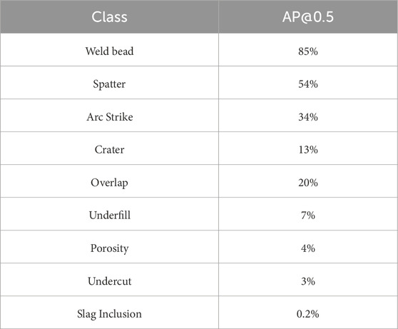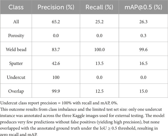 Table 7 lists the class-wise AP@0.5 scores. The highest performance was achieved for the weld bead (85%) and spatter (54%), followed by moderate values for arc strike, overlap, and crater. Lower values for porosity, underfill, undercut, and slag inclusion reveal that detection reliability scales with object size and contrast: significant, well-defined discontinuities are detected more consistently, whereas minor or edge-like defects remain recall-limited.