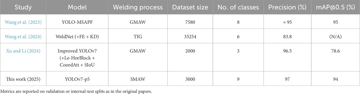 To contextualize the performance, Table 9 compares the proposed model, YOLOv7-p5, with recent weld-defect detectors across different welding processes and dataset sizes. Reported metrics reflect the evaluation split used in each study: YOLO-MSAPF (Wang et al., 2023) reports on its validation subset of GMAW images; WeldNet (Wang et al., 2024) reports on a held-out test subset of 33254 TIG images; (Xu and Li, 2024); report averages over internal test subsets from multiple splits (6:3:1–8:1:1); and this work reports validation results for model selection and provides an independent test-subset evaluation. Unlike prior works centered on GMAW/TIG, our study contributes an annotated SMAW dataset (3000 images, nine classes). It shows that process-specific data and training optimization can match or exceed the accuracy of an architecturally enhanced model while maintaining practical efficiency.